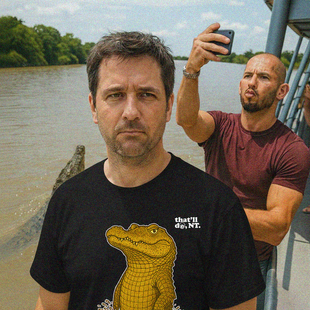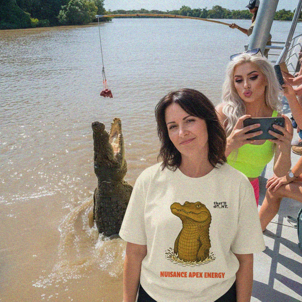 Think of them as the NT’s badly behaved influencers: unpredictable, always in the headlines, and somehow more famous than the place itself. This tee tips its hat to the Territory’s true star with pure Nuisance Apex Energy. Only in Australia could a deadly apex predator with a history of attacking humans be written off as a “nuisance” — and nowhere is that understatement stronger than in the NT, where both humans and reptiles lean into it. Problematic, self-centred, impossible to ignore — the saltie’s had Main Character Energy since 1986, when Crocodile Dundee set the tone.